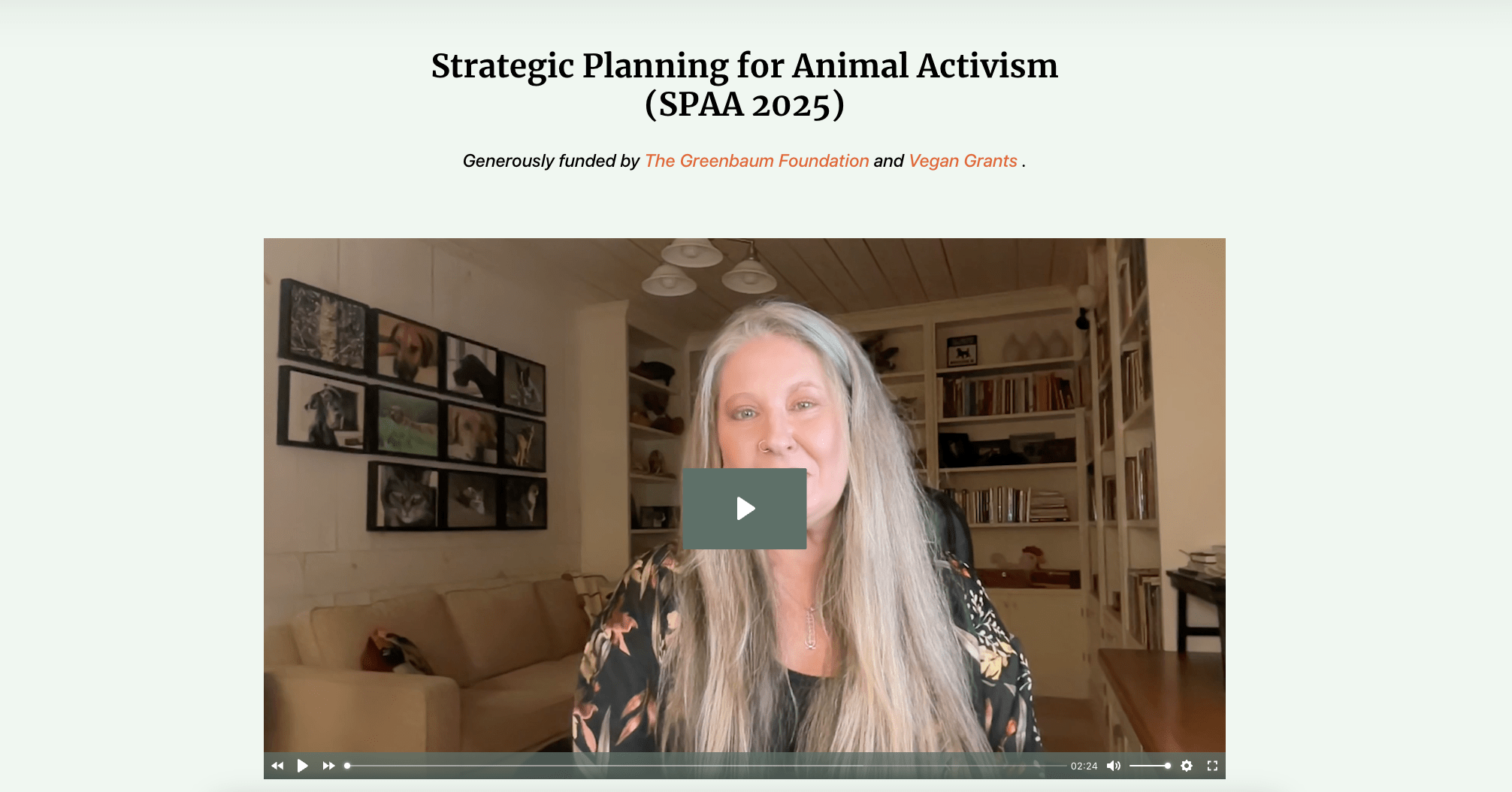 An announcement from Dr. Krista Hiddema: Strategic Planning for Animal Activism (SPAA) course for 2025 is now open!This is your opportunity to be part of a transformational experience designed to amplify your impact within the realm of animal rights and vegan advocacy. Thanks to the generous support of The Greenbaum Foundation and Vegan Grants, this comprehensive program is offered at no cost to you.