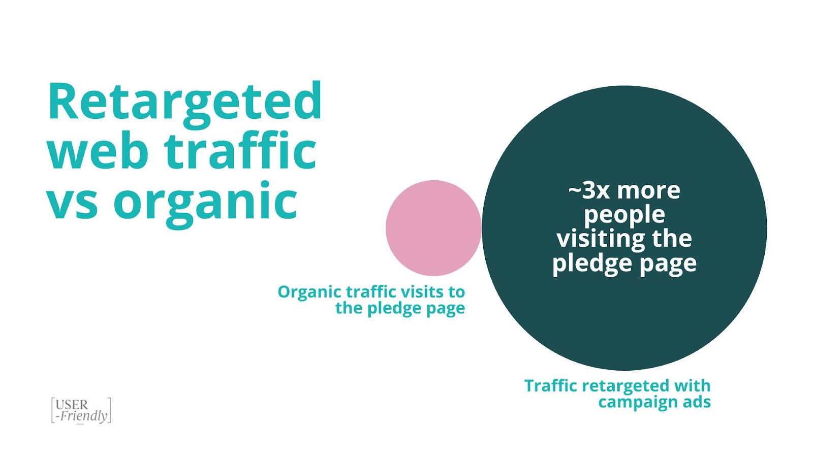 Retargeting web traffic with campaign-branded ads produced almost 3x more people visiting the pledge page compared to organic traffic visits to the pledge page, despite organic traffic representing twice as many new users overall